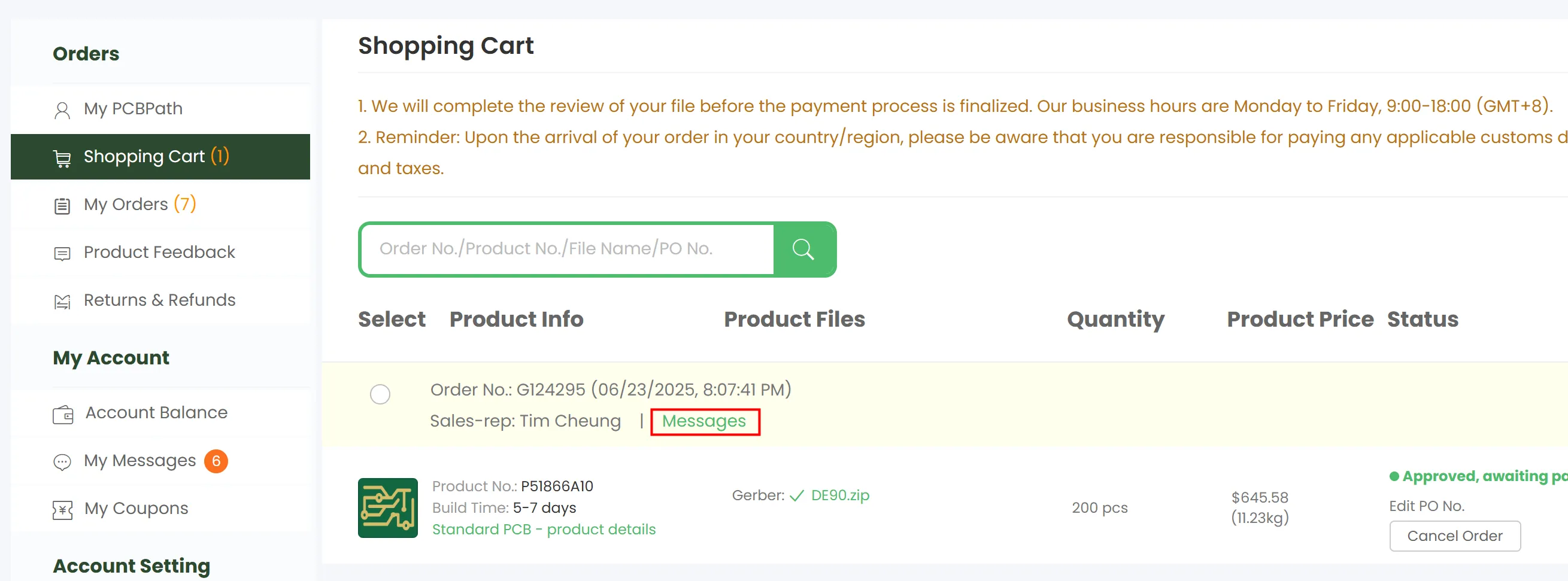 For any specific order, click the Messages link next to it to directly communicate with the assigned customer service team about that order.