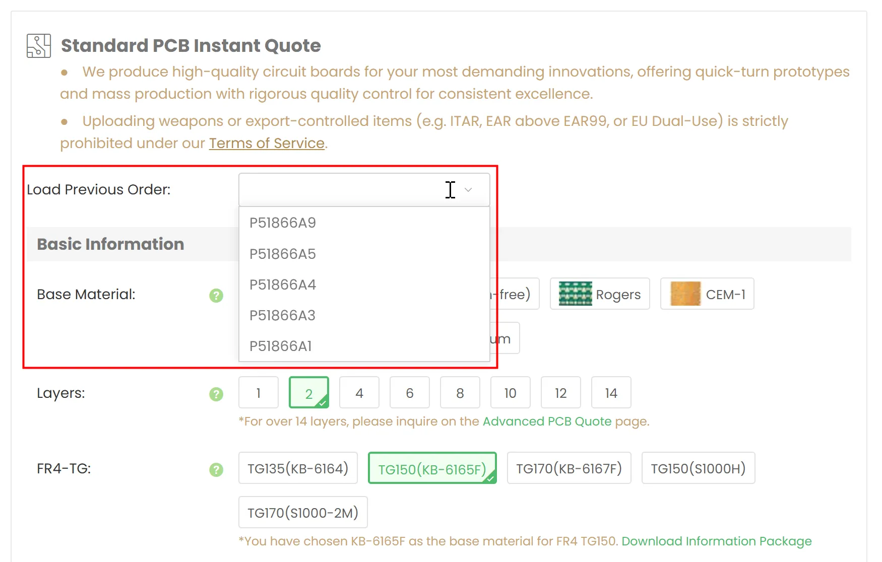 The system will automatically load the corresponding specifications (e.g., board dimensions, layer count, and materials) from the selected order.